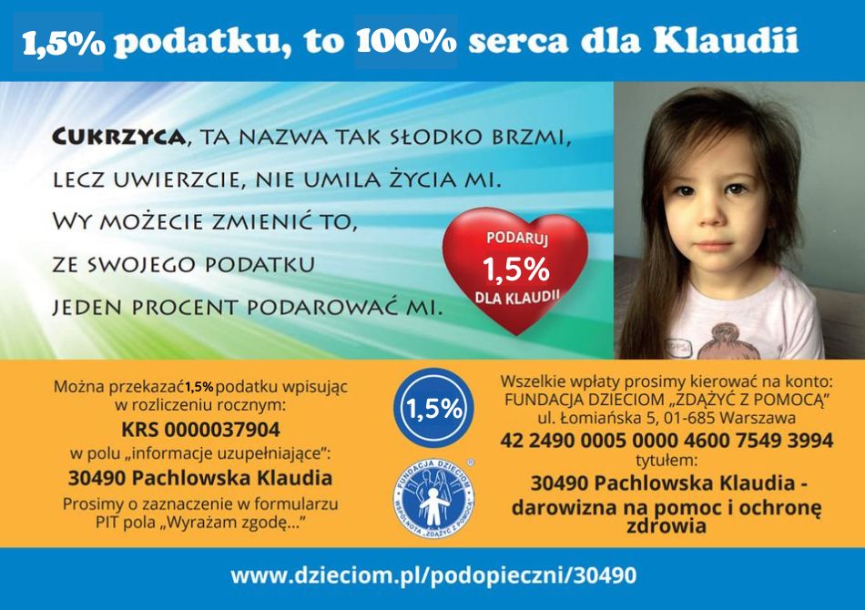 Klaudia urodziła się 29.08.2014 r. jako zdrowa, śliczna dziewczynka. W wieku 9 miesięcy zachorowała na cukrzycę typu 1. Jest to choroba przewlekła i na ten moment nieuleczalna.